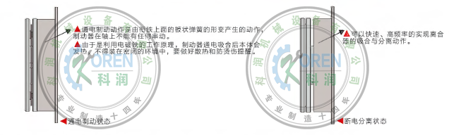 電磁制動(dòng)器,通電后磁軛里面的漆包線圈有了電流,它們里面了電磁鐵的工作原理就有了磁力。磁力相當(dāng)于磁鐵,就會(huì)吸住旁邊的銜鐵,銜鐵后面有個(gè)板子一樣的彈簧被拉了變形了,銜鐵就會(huì)和磁軛成為一個(gè)整體的機(jī)構(gòu),紋絲不動(dòng),這個(gè)過(guò)程發(fā)生的很快,頻率高壽命長(zhǎng)。斷電后磁軛里面的漆包線圈沒(méi)有了電流,磁力瞬間沒(méi)有了反應(yīng)快。銜鐵后面有個(gè)板子一樣的彈簧在反作用力下恢復(fù)到它本來(lái)的狀態(tài)了。