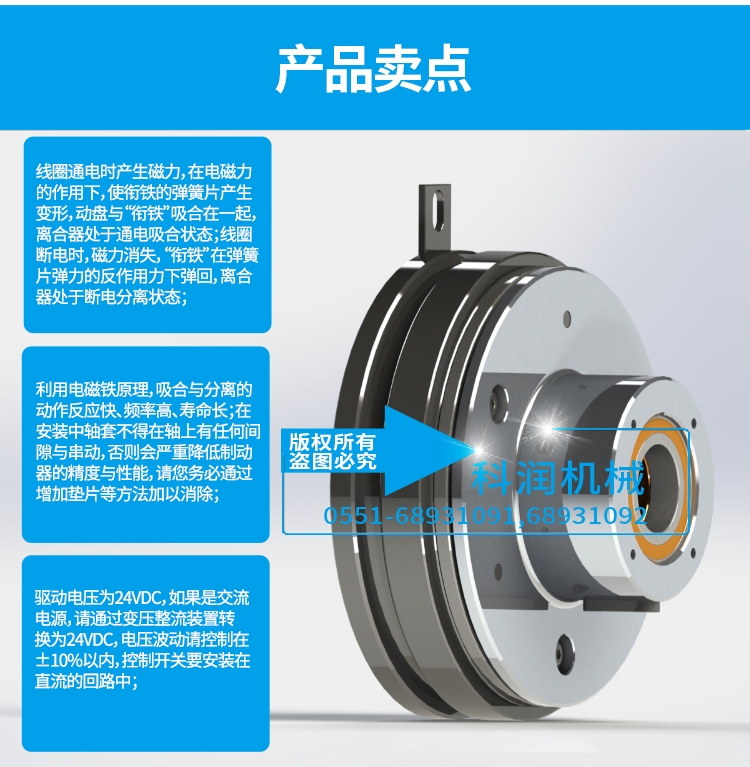 使用了電源24V直流電壓的操作。當定子提供給它了24V直流電壓時, 科潤機械加工的電樞板就這樣被吸引到了轉(zhuǎn)子上面的摩擦材料與之的空氣間隙和扭矩得到傳遞沒有反彈。當24V直流電源被關(guān)閉了時, 預(yù)應(yīng)力彈簧把電樞拉回原來的位置。